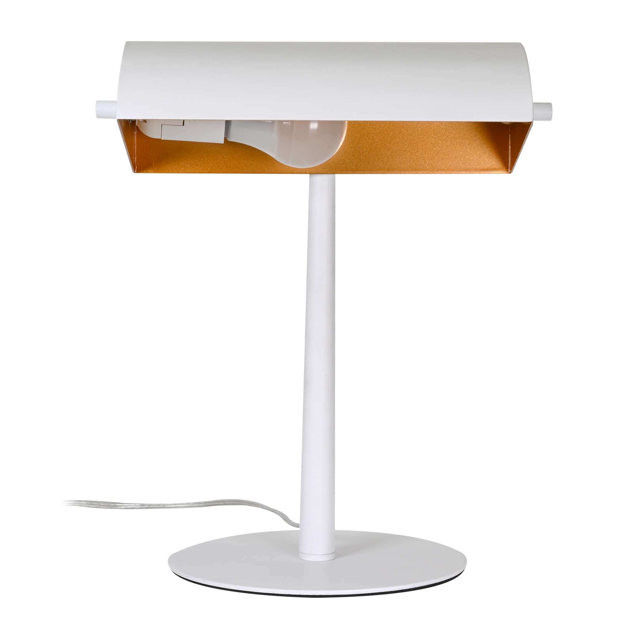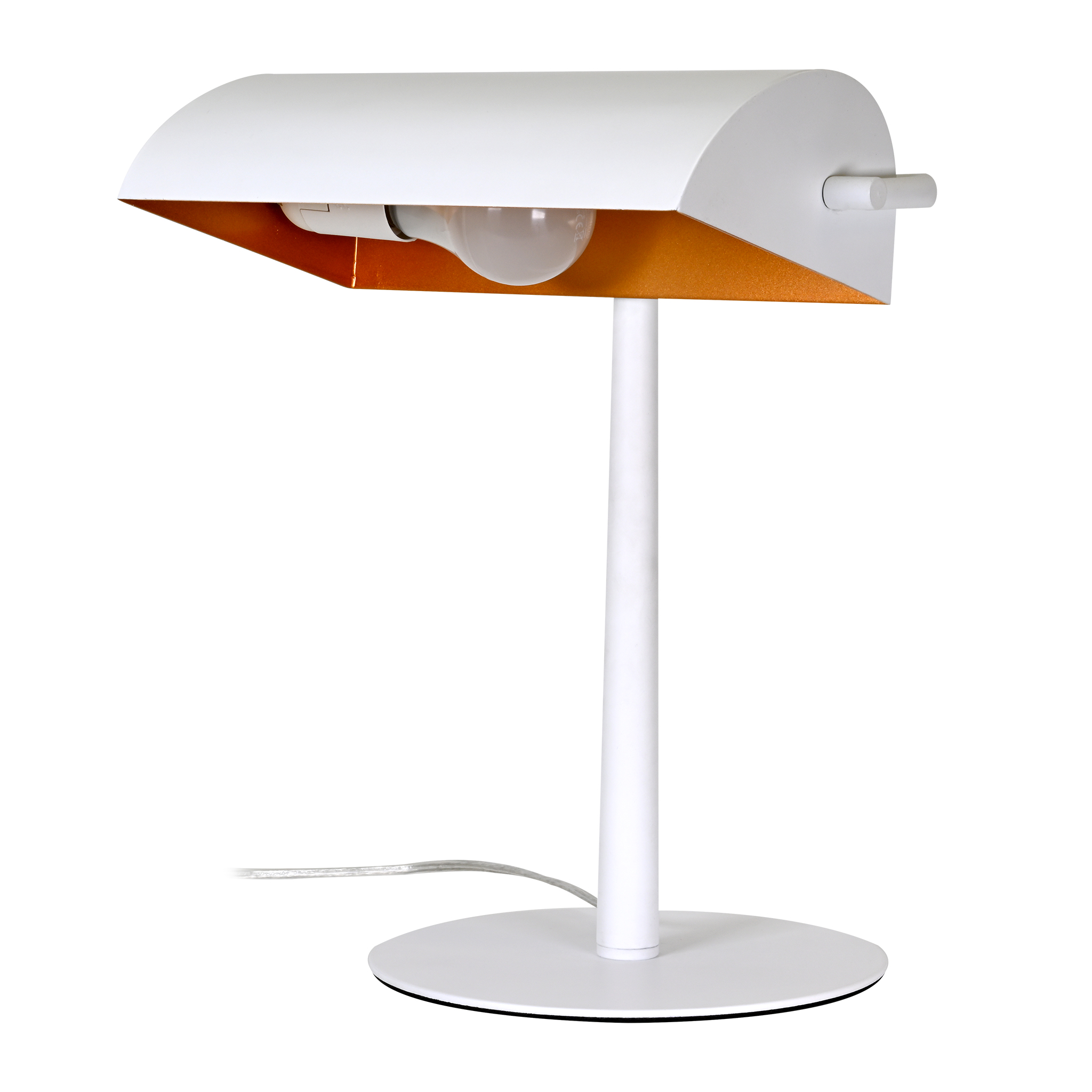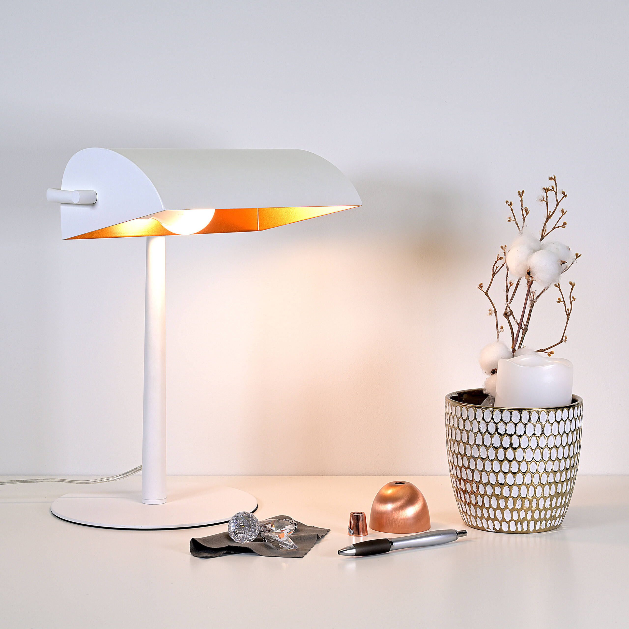 Jotain uutta, jotain vanhaa… Perinteinen pankkiirivalaisin on saanut uuden muodon, lasinen kupu on korvattu metallisella, jonka kuparinvärinen sisus kruunaa kokonaisuuden. Valkoinen runko saa valaisimen soveltumaan monenlaiselle työpöydälle.